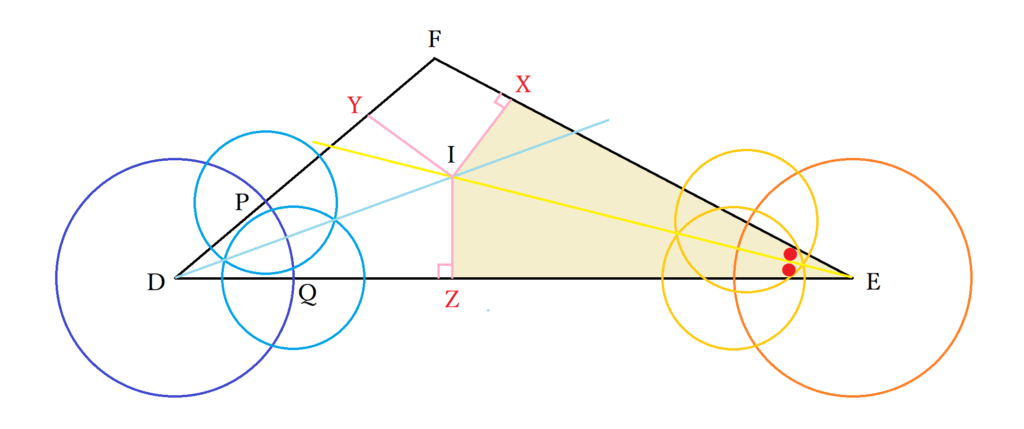 同様に、△EIZと△EIXにおいてIEは共通・∠IEZ=∠IEX(∵IEは∠Eの二等分線)・Iから辺DE.FEへの垂線をそれぞれZ.X としているので、∠EZI=∠EXI=90度です。つまり、△EIZと△EIXは斜辺と他の1つの角が等しい直角三角形のため合同であり(△EIZ≡△EIX)、IZ=IXが成り立ちます。したがって、IX=IY=IZとなり、Iを中心に三角形DEFの3つの辺に接する円が描けることがわかりました。