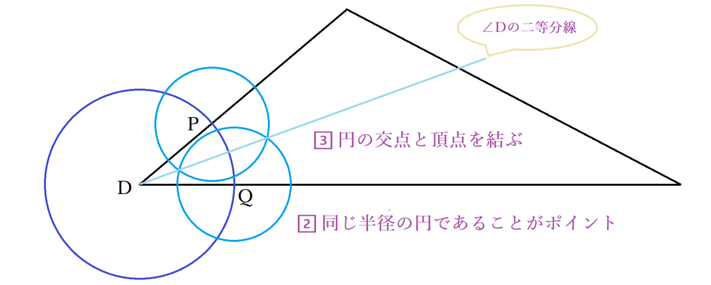 P.Qを中心に同じ大きさの円を描き、その二つの円の交点をRとしましょう。直線DRは∠Dの二等分線になります。PQはDを中心とする円周上にあるためPD=QD、RはP.Qから距離の等しい点としているのでPR=QR、DR共通で△PDRと△QDRは合同になるためです。