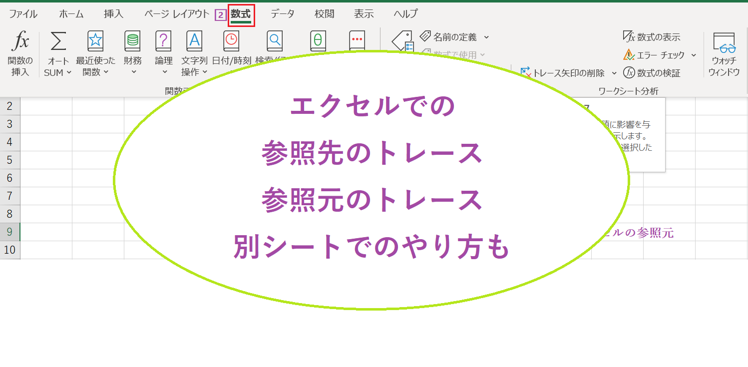 Excelの上部にある『数式』のタブに「ワークシート分析」がまとまっており、これらを使うことで参照元や参照先のつながりを視覚的に整理が可能です。特に、数式が複数のセルを行き来している場合には、参照先に飛ぶ操作をくり返すよりも、目で見える形で確認した方が全体の流れをつかみやすくなります。では、それぞれの機能をどのように使うのが便利なのか、次の項目で順番に見ていきましょう。